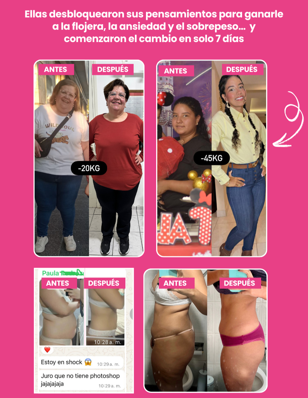 Muchas participantes notan cambios en la primera semana: menos inflamación, más energía y mejor descanso. La pérdida de peso varía según cada persona, pero el promedio de nuestras alumnas está entre 4 y 6 kg en 28 días, de forma saludable y sin poner en riesgo tu bienestar.